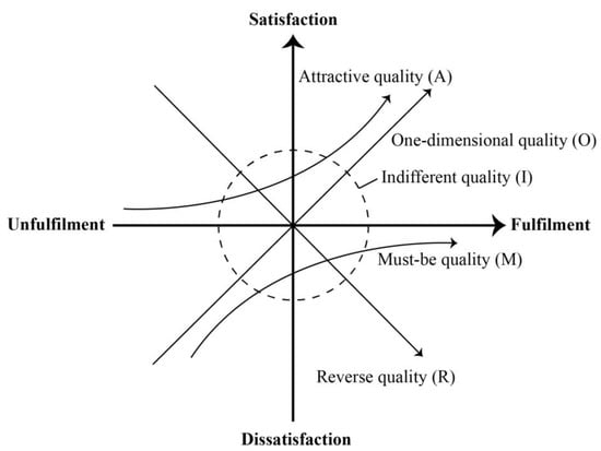 As this study explores the issue of whether a facility should be allocated in different “human–land urbanization patterns”, it focuses on examining people’s attitudes toward the provision of a given facility. Therefore, satisfaction was selected as the measurement indicator. The measurement methods for satisfaction can be divided into two categories: experiential and hypothetical evaluation. The former measures overall satisfaction using standardized scales, such as SERVQUAL [47], or through methods with their own indicator systems, such as the analytical hierarchy process (AHP) [48]. Additionally, there are methods that assess individual attribute satisfaction, such as importance performance analysis, which segments attributes into four quadrants [49]. To develop the programming guidance-control system, facilities that are not yet available but may constitute part of residents’ potential needs should be considered in addition to those included in the public service system. Accordingly, this study aims to employ a “hypothetical” method to measure satisfaction in order to identify the characteristics of the needs structure. The Kano model is precisely such a method, which was proposed by Professor Kano Noriaki of the Tokyo Institute of Technology in 1984 [50]. This model has been widely applied in the fields of service development and improvement [51,52]. It suggests that not every service provision or lack thereof will increase or decrease, respectively, users’ satisfaction with the service in question [53].