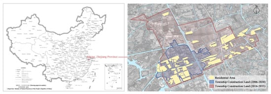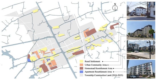 This study aimed to select a sample of small towns that exhibit the dual complexity of human–land urbanization. Due to the development trend of the industrial economy over the past decade, S town in Jiaxing City, Zhejiang Province, has been continuously developing industrial parks in its northern and eastern regions, resulting in a gradual expansion of township construction land into urban areas (Figure 5). Currently, the township construction land includes various types of residential areas, such as rural settlements, homestead resettlement areas, urban community areas, and apartment resettlement areas (Figure 6). Differences in urbanization characteristics are evident among residents in the different residential areas. The majority of the residents living in rural-biased residential areas have not yet converted their household registration and continue to rely on agriculture as their primary source of income. Meanwhile, most residents living in urban-biased residential areas have fully transitioned away from agriculture, and displaced farmers have found employment in local industrial parks. Overall, the residential areas and residents within S Town exhibit complex urbanization characteristics, making the town an appropriate sample for the study.