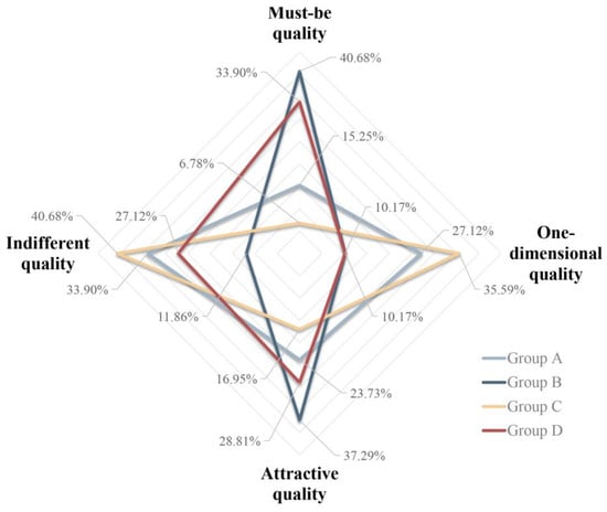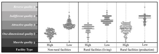 The better and worse values were used to plot a four-quadrant diagram based on their absolute values. As better and worse values are continuous, the intersection point of the axes was established as the average value. The four quadrants represent the following categories: one-dimensional (I), attractive (II), indifferent (III), and must-be (IV) qualities. Consequently, the four groups’ facility attributes were classified (Table 5, Figure 9, Figure 10, Figure 11 and Figure 12).