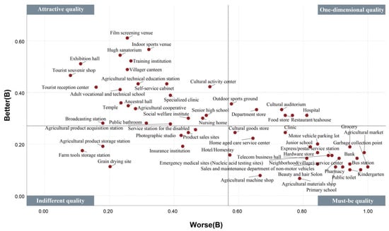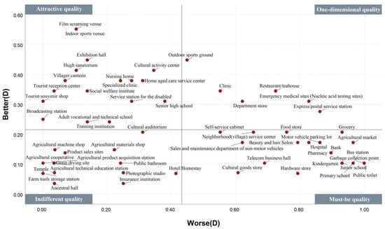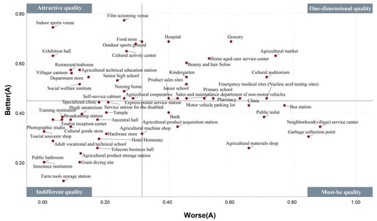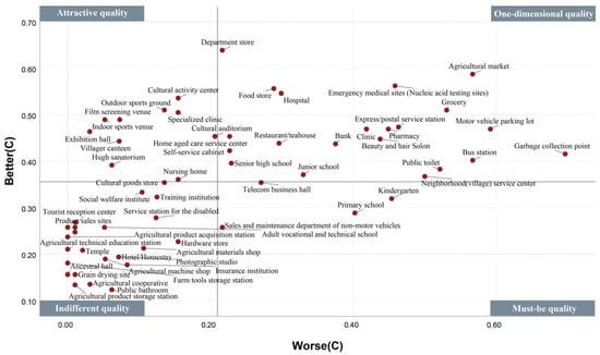 After determining the individual residents’ cognitive attributes regarding facilities, a further assessment of the needs of the groups was necessary. In the traditional Kano model, when there are multiple cognitive attributes that are close to or have a percentage similar to the highest-rated attribute, defining the attribute category based on the maximum value may result in some people’s needs being ignored [57]. This study applied better–worse coefficient analysis to identify the similarity of individuals’ cognitive attributes. Better and worse values represent the degrees of improvement in the satisfaction of residents after a facility is provided and those of the increase in dissatisfaction after it is not provided, respectively [58]. The calculation method for better and worse values is as follows:
