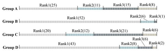 This study used the Kano evaluation table to determine the cognitive attributes with respect to facilities among individual residents. To measure the participants’ levels of recognition of rural and nonrural facilities, attribute values were assigned (must-be = 1, one-dimensional = 2, attractive = 3, indifferent = 4, and reverse = 5). The average value for the different types of facility attributes was calculated for each individual, and a violin plot was created (Figure 7) to make a preliminary judgment on the data distribution. There were distinct peaks and valleys in the three categories, indicating that the residents’ perception of these facilities had a certain degree of clustering, further confirming the hypothesis of population classification and demonstrating the feasibility of clustering. As a violin plot can visually determine the number of clustering groups, the K-means clustering method was used to cluster the cognitive attributes of the three types of facilities into high and low levels (Figure 8). As a result, four groups were identified, with Groups A, B, C, and D consisting of 35, 90, 98, and 29 individuals, respectively.