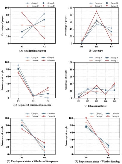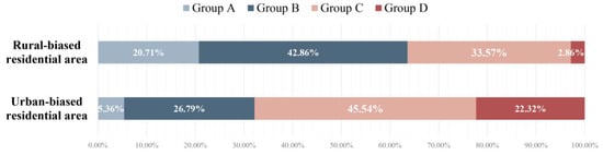 According to the chi-square test (Table 6), there was a significant correlation between the individuals’ urbanization levels and the type of residential area in which they lived (p < 0.05). Proportion analysis (Figure 16A) showed that two groups with lower levels of urbanization (Group A and Group B) tended to live in rural residential areas, while Group D tended to live in urban residential areas. The proportion of these types of residential areas in Group C was roughly equal. Due to the large population base of Group B, the proportion of residents in urban-biased residential areas could not be neglected (26.79%). According to a proportion analysis of the groups in different residential areas (Figure 17), the residents in Groups B, C, and D were the main residents in urban-biased residential areas (accounting for over 94.64% of the total), while those in Groups A, B and C were the main residents in rural-biased residential areas (accounting for over 97.14% of the total). This indicates a relatively matched relationship between the urbanization patterns for residents and residential areas.