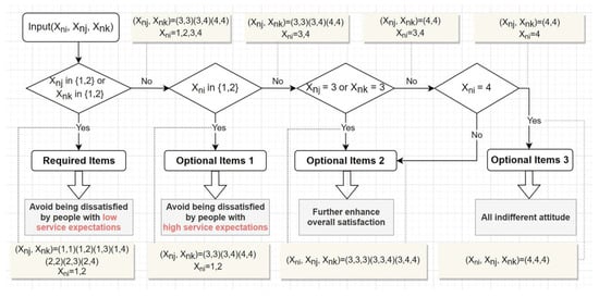If a facility receives an unsatisfactory rating from residents with low service expectations because of its absence, it should be categorized as “Level 1: Required Items” (either Xnj or Xnk is one or two). The next level should meet the needs of the residents with high service expectations. Facilities that may result in dissatisfaction if not provided to this group should be designated as “Level 2: Optional Items 1” (Xni is one or two). After addressing dissatisfaction due to the absence of certain facilities among the different resident groups, the facilities that can further enhance satisfaction for the three groups of residents should be designated as “Level 3: Optional Items 2” (Xni, Xnj, and Xnk are all neither one nor two but three). In addition, there are types of facilities toward which all three groups have an indifferent attitude. These facilities transcend or fall behind the current production and living needs of residents and can thus be temporarily excluded from consideration. In this study, they are designated as “Level 4: Optional Items 3” (Xni, Xnj, and Xnk are all equal to four). The specific process is shown in Figure 18.