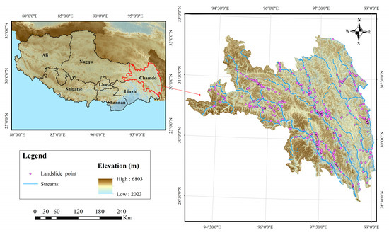 As the research area selected for this study, Changdu (as shown in Figure 1) is located in the eastern part of Tibet, with a total area of 109,816 square kilometers, 93°6′–99°2′ east longitude, 28°5′–32°6′ north latitude, looking east to Sichuan, southeast bordering Yunnan and Qinghai to the north, and located in the Hengduan Mountains and the basins of the Jinsha River, Lancang River, and Nujiang River, at the junction of the Eurasian plate and the Indian Ocean plate. Neotectonic movement has caused significant landform differences in Changdu, with complex terrain and large elevation differences, and generally with a relative elevation difference of more than 2000 m [39]. The rock and soil in this area are often exposed, with broken and loose deposits formed under the action of freeze-thaw weathering [40], coupled with the strong geological movement of external forces, resulting in frequent and large-scale geological disasters in the area, which are extremely serious [41].