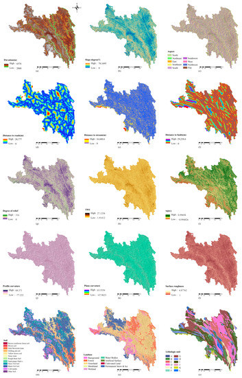 Landslide evaluation factors. (a) elevation, (b) slope, (c) aspect, (d) distance to roads, (e) distance to streams, (f) distance to faults, (g) degree of relief, (h) the topographic wetness index (TWI), (i) the Normalized Difference Vegetation Index (NDVI), (j) profile curvature, (k) plane curvature, (l) surface roughness, (m) soil, (n) land-use, (o) lithology unit (the lithological categories are described in Table 2).