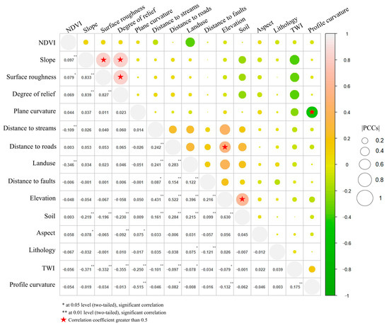 The Pearson product–moment correlation coefficient is widely used in landslide susceptibility evaluation to measure the strength of the correlation between evaluation factors [59,60]. The results of the correlation analysis of this study are shown in Figure 4. Among the 15 evaluation factors initially selected, the correlation coefficient between elevation and soil type was 0.630, indicating a relatively strong correlation. The correlation coefficients of degree of relief were 0.833 and 0.839, respectively, which were strongly correlated. The correlation coefficients between elevation and distance to roads and between profile curvature and plan curvature are 0.522 and −0.515, respectively, with absolute values greater than 0.5, showing a high degree of correlation. Therefore, elevation, profile curvature, degree of relief, and slope were excluded.