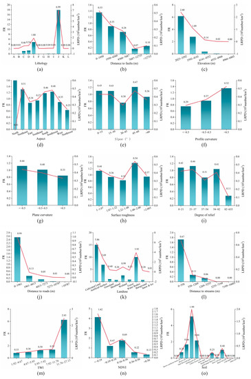 Frequency ratio of landslide evaluation factors and density of landslide relative point. (a) lithology unit (the lithological categories are described in Table 2), (b) distance to faults, (c) elevation, (d) aspect, (e) slope, (f) profile curvature, (g) plane curvature, (h) surface roughness, (i) degree of relief, (j) distance to roads, (k) land use, (l) distance to streams, (m) the topographic wetness index (TWI), (n) the normalized difference vegetation index (NDVI), (o) soil.