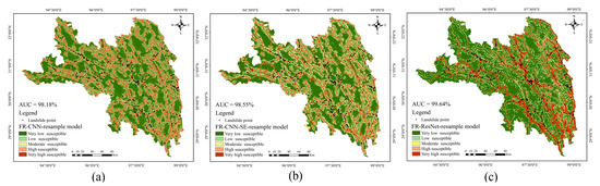 Map of landslide susceptibility classification (a) FR–CNN–Resample, (b) FR–CNN–SE–Resample, (c) FR–ResNet–Resample.