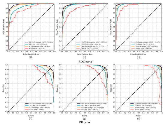 Model performance analysis of different sampling methods ROC and PR curve, where (a,d) CNN, (b,e) CNN–SE. and (c,f) ResNet.