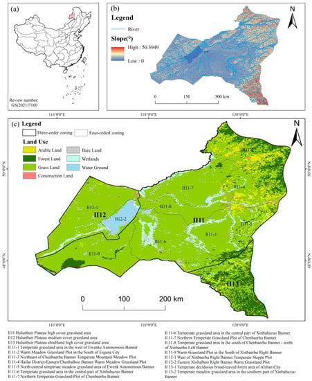 The boundary delineation of the temperate grassland subzone of the Hulunbuir Plateau is based on the natural resource element observation study of the Geological Survey of China, Ministry of Natural Resources, by Liu et al. [17,18,19,20,21]. The study is based on the project planning and implementation of an integrated observation system for natural resource elements in China [22,23,24,25]. Our study area is a subregion under the Inner Mongolia Plateau Grassland Resource Region, with an area of 91,398 km2, including three zones: Hulunbuir Plateau high-cover grassland region, Hulunbuir Plateau medium-cover grassland region, and Hulunbuir Plateau shrubland high-cover grassland region. These zones are referred to as high-cover grassland region (II11), medium-cover grassland region (II12), and shrubland high-cover grassland region (II13). The 3 regions contained 13 four-level zones, including the central warm grassland plot of Xinbaerhuzuo Banner, the northern part grassland plot of Chenbaerhu Banner, the southern New Baerhuzuo Banner warm grassland plot of Chenbaerhu Banner, and the north-central warm meadow grassland plot of Ewenki Autonomous Banner.