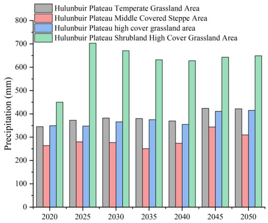 Soil erosion occurred mainly in the high plains of the central Hailar Plateau, the north side of Hulun Lake, and the Daxing’a Mountains area. Figure 3 demonstrates that the strongest erosion area was the western foothills of the Daxing’a Mountains, where there are high slope undulations and precipitation, about 100 mm higher than the average value, with grassland vegetation that easily erode. Soil erosion in the central region was reduced in 2005 compared to 2000, mainly due to the low precipitation of ~250 mm that year. The significant increase in soil erosion in 2020 compared to 2015 could be due to the large increase in the annual precipitation, which was about 12% higher than the previous cycle. The highest soil erosion values were concentrated in the eastern mountainous areas due to the large topographic relief and relatively high precipitation in the region. In contrast, the area with the lowest erosion was located on the south side of Hulun Lake, where the topography is smooth and has low precipitation and human activities. Figure 4 shows the 2020 and future with precipitation data.