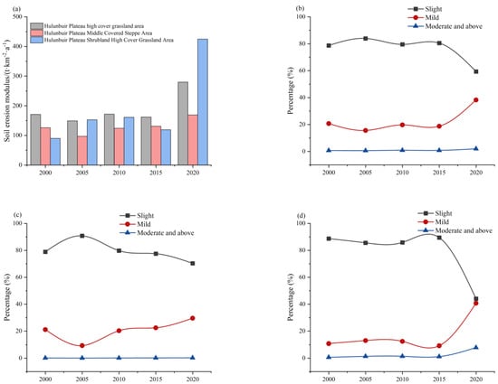 Temporal variation of (a) soil erosion modulus (t·km−2·yr−1) and percentage (%) of soil erosion grades in the three zones (b) II11, (c) II12, and (d) II13 from 2000 to 2020.