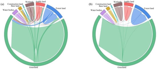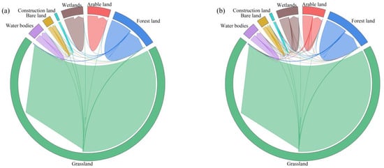 Land use changes in historical periods: (a) Land use change from 2000 to 2010; (b) Land use change from 2010 to 2020.