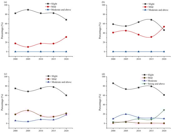 Temporal variations of percentage (%) of soil erosion grades at different slopes at (a) 0–5°, (b) 5–8°, (c) 8–15°, and (d) 15–35° from 2000 to 2020.
