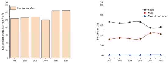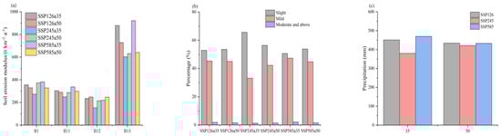 Figure 13 shows the erosion module of SSP126a35, SSP126a50, SSP245a35, SSP245a50, SSP585a35, and SSP585a50 in the study area was 355, 329, 273, 373, 382, and 328 t·km−2·yr−1, respectively, indicating mild erosion. SSP126a35, SSP126a50, SSP245a35, SSP245a50, SSP585a35, and SSP585a50 represent soil erosion in the 35- and 50-year SSP126 scenarios. The six erosion modulus of high-cover grassland area (II11) were 304, 289, 249, 287, 337, and 298 t·km−2·yr−1, respectively, all mild erosion. The erosion modulus of the medium-cover grassland zone (II12) were 235, 248, 153, 215, 220, and 247 t·km−2·yr−1, respectively, all mild erosion. The erosion modules of shrubland high-cover grassland area (II13) were 879, 724, 602, 631, 922, and 641 t·km−2·yr−1, respectively, all mild erosion. The percentage of mild erosion in both 2035 and 2050 in scenario SSP245 will be smaller than that under scenarios SSP126 and SSP585 because the precipitation in scenario SSP245 will be smaller than in scenarios SSP126 and SSP585.