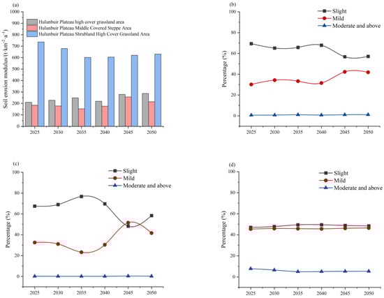Figure 8 shows that future soil erosion will be concentrated mainly in the eastern mountains and the central high-density plateau grassland area. The moderate and above erosion will primarily occur in the western foothills of the Daxing’a Mountains. Furthermore, the western medium-density grassland area erosion will be relatively low, and the most vulnerable area for erosion will be the eastern area of Hulun Lake. A significant increase in erosion area will be in the central part in 2045 and 2050.