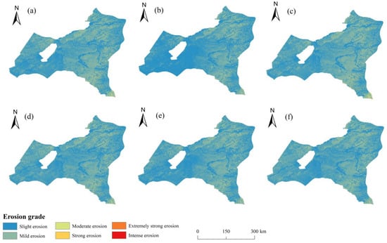Spatial variation of soil erosion grade in the historical period (a) 2000, (b) 2005, (c) 2010, (d) 2015, and (e) 2020.