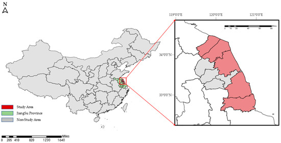 The study focuses on the roosting area of overwintering red-crowned cranes in Yancheng, Jiangsu Province, which comprises five regions: Xiangshui, Binhai, Sheyang, Dafeng, and Dongta [5,15] (Figure 1). The Yancheng area of Jiangsu Province is situated in the northeastern part of Jiangsu Province (latitude 32°10′–34°21′ N, longitude 118°34′–121°08′ E). In terms of its national geographic location, Yancheng City is located in the coastal zone of eastern China and holds significant importance as part of the economic zones of eastern Shanghai, southern Jiangsu, and the coastal economic zone of Jiangsu. Yancheng is situated at the confluence of hills and plains, characterized predominantly by flat terrain; the southern region is encompassed by the Yangtze River Delta Plain, while the northern part of Jiangsu Province features the historic Yellow River Plain. The region exhibits minor undulations, with the highest elevation reaching up to 182 meters. The climate in the Yancheng area is a subtropical monsoon climate with an average annual temperature of about 13 °C and average annual rainfall of about 924 mm [16]. According to statistics, the population of red-crowned cranes in the area has shown a gradual increase since 1982, rising from about 200 to the current population of approximately 1000. As of 2001, a total of 1128 red-crowned cranes have been recorded in the Yancheng mudflat area. This number accounts for 94% of the total number of wintering cranes in China and 80% of the total number of migrating cranes in the world [6]. Due to the impact of human activities on the climate and environment, the habitat of cranes is constantly facing destruction and significant fragmentation. Consequently, the population of cranes has experienced a decline in recent years [17]. Therefore, conducting scientific measurement and an analysis of its key influencing factors, as well as further exploring strategies, is necessary for the preservation of cranes and their habitat.