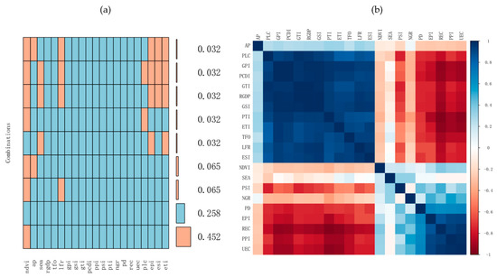 Furthermore, this section aims to select a suitable method for filling in missing data. Upon investigating the missing data, it can be observed that the percentage of missing values among the 21 indicators is distributed between 0% and 45% (Figure 2a). The Spearman correlation coefficient heat map among the indicators reflects a certain correlation among the missing data (Figure 2b), which can be classified as a random missing type. Based on the above exploration of missing data types, using sample statistics to fill in the data would reinforce the sample bias in the original data and result in model distortion. Therefore, in this section, a multiple imputation dataset was constructed based on the multiple imputation by chained equations (MICE) method [22,23]. The predictive mean matching (PMM) method algorithm was used to calculate the initial filled values, and multiple regression models were constructed to fill in the missing values using data from other observed columns after several iterations until convergence [24].
