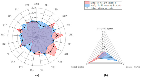 (a) Results of EES system index comprehensive weights. (b) Results of comprehensive weights of economic, ecological and social systems.