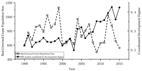 However, it is noteworthy that in 1997, 2009, and 2013, the population size of red-crowned crane exhibited an opposite trend with the degree of coordinated development within the EES system. Surprisingly, the population size showed a significant decline despite the increasing trend in the system’s degree of coordinated development, with decrease rates of 16.86%, 21.56%, and 14.02% accordingly. Moreover, although the overall degree of coordinated development within the EES system showed an increase with a growth rate of 61.35%, it is important to highlight that the highest degree of development achieved during the sample period was only 0.4175 from a numerical point of view, and there is still much potential for improvement.