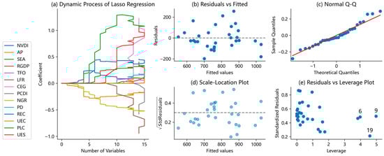 In this study, we fit a generalized linear model (GLM) based on the Poisson family and negative binomial family of the above explanatory variables to deeply analyze the factors affecting the habitat quality in the Yancheng area. Due to the high dimensionality of the variable set, the fitted GLM model exhibits a significant degree of multicollinearity. To eliminate this phenomenon, this study conducted LASSO regression to select significant explanatory variables from the variable sets. The results revealed that the best combined results, considering both residual squared and penalty terms, retained six variables (Figure 5a): normalized vegetation index, annual rainfall, soil erosion area, natural population growth rate, Engel’s coefficient of rural residents, and public library collection. Subsequently, the GLM models based on Poisson and negative binomial families were fitted using these six variables. Notably, the negative binomial regression model optimized based on LASSO regression exhibited the lowest AIC and BIC values (Table 4), which are 396.58 and 408.05, respectively. Further analysis indicated that the residuals of the model were uniformly distributed and adhered to the Gaussian–Markov assumption (Figure 5b,d). Additionally, the model passed the normality test (Figure 5c), indicating minimal influence from outliers. However, a few influential points were identified, which affected the fitting effect (Figure 5e).