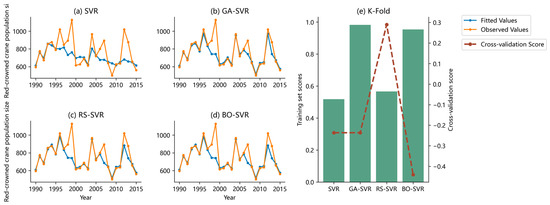 To gain a better understanding of the factors influencing the habitat quality of the cranes, the SVR model was used to predict and analyze the population size of the cranes in the Yancheng area. The SVR model was constructed by combining the index weights obtained from the comprehensive "EWM-AHP" evaluation model with various optimization algorithms (Figure 6). The results revealed that the cross-validation scores of the original model (SVR), the genetic algorithm-based model (GA-SVR), and the Bayesian-optimization-algorithm-based model (BO-SVR) ranged from −0.4401 to −0.2364. Furthermore, the training set scores of the GA-SVR and BO-SVR models are 0.9820 and 0.9537, respectively. These scores indicate that the GA-SVR model and BO-SV model are overfitted and exhibit a lower prediction accuracy. In contrast, the model based on the random search algorithm (RS-SVR) demonstrated improvements in both the training set score and the cross-validation score compared to the original model, with 9.39% and 52.64%, respectively.