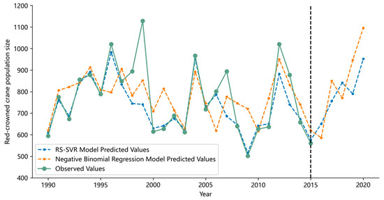 Based on the predicted results of the RS-SVR model for the population size of the red-crowned crane in the Yancheng area from 2016 to 2020 (Figure 7), it can be observed that the population size of the red-crowned crane was 877 in 1994, while it decreased to 561 in 2015. This decline shows a fluctuating downward phenomenon with an overall decline rate of about 36.03% during the sample period. Furthermore, according to the predicted data of the model, since 2015, the population size of the cranes has been on an upward movement with a growth rate of about 69.70%.