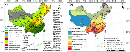 Spatial distribution of (a) the ecosystem types and (b) the climatic regions of China and spatial distribution of sites of multi-source observation datasets.