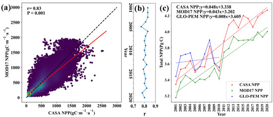 (a) The correlation (r) of MOD17 NPP and CASA NPP in 2001. (b) We calculated the correlation between CASA NPP and MOD17 NPP for 2001–2020 and (c) compared the consistency of the trend in total NPP for GLO-PEM NPP, MOD17 NPP, and CASA NPP.