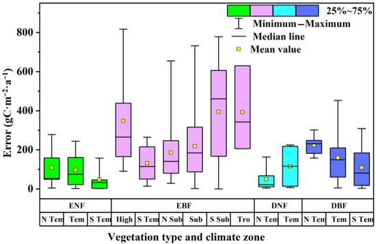 The MAE in the estimation results of ENFs was less than 110 gC·m−2·a−1 in all the temperate climate zones, with the smallest error (60 gC·m−2·a−1) in the northern temperate zone. EBFs in tropical and subtropical regions had relatively high NPP values and a wide range of fluctuations due to high temperatures and humid environments.