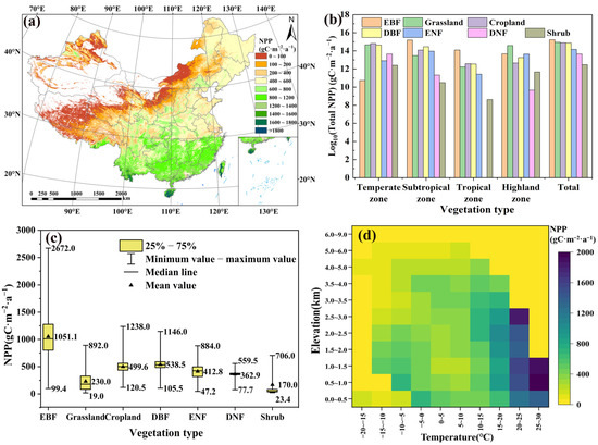 (a) Spatial distribution of the mean NPP from 2001 to 2020. (b) Total NPP of different terrestrial vegetation in 2020. (c) The distribution of NPP of different vegetation in 2020. The data were logged due to the excessive difference in the total NPP values of different types of vegetation. (d) The mean NPP in different elevation and temperature areas.