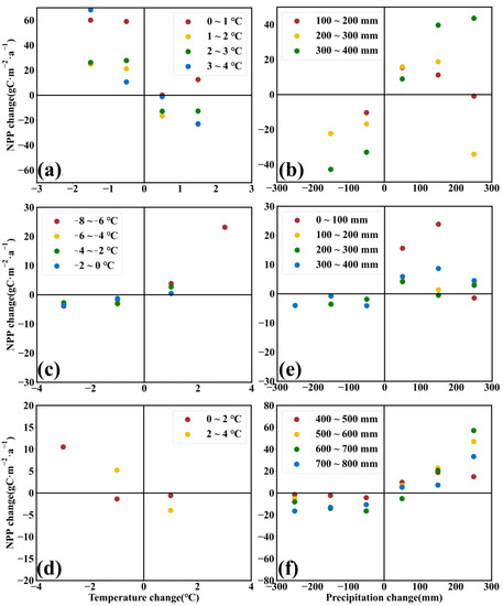 Quantitative analysis of the effects of (a) temperature and (b) precipitation changes on NPP changes in the Inner Mongolia grassland region, effects of (c,d) temperature and (e,f) precipitation changes on NPP changes in the Qinghai–Tibet Plateau grassland region. The points between the two scales in the horizontal coordinate indicate the change in NPP when the temperature or precipitation changes within this range.