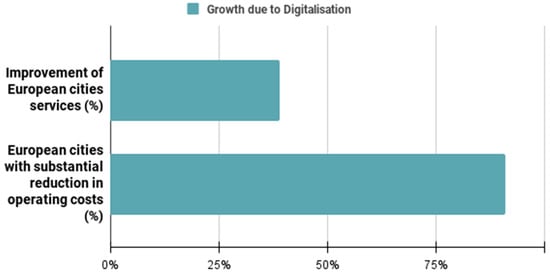In a recent study by ESPON [], some numerical estimates are provided of the improvement in services and the increase in uptake in various European cities following the implementation of digital solutions: 91% of city services improved, and 30% of European cities saw a substantial reduction in operating costs after implementing digital technology (see Figure 1).