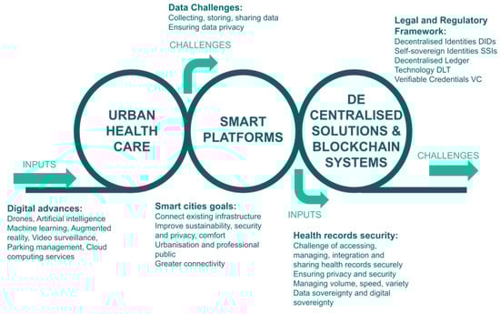 In developing a performant centralised platform that improves citizens’ interaction, it is pertinent to consider the ownership and control of data and not affecting privacy and confidentiality regulations. This is complicated in the case of centralised platforms dealing with data from multiple actors. When considering digital urban healthcare solutions, personal data need special attention. Tan [] refers to this complication and presents a study on legal perspectives on the requirements and their challenges in adoption from two points of view on sovereignty: data sovereignty and digital sovereignty. In this context, the awareness of the importance of data and their privacy [,,] over digital platforms prompts a transition from centralised toward decentralised solutions where people are in control of their own data. Cities tend to become both data-user and producer communities.