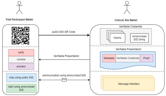 Decentralised identifiers (DIDs) are verifiable decentralised identities that are bound to physical identities or human persons. It is strictly forbidden to attach any information to the DID document itself, even a person’s public name or other identifiable information such as email address. The DID correlation represents an important issue raised by the user community. A reasonable solution is to use pairwise DIDs to assure a still-unique relationship. As an illustration, a clinical site actor (using advanced randomisation techniques) may issue an implemented anonymised DID, add verifiable credentials and present it to the trial participant using the public DID of the trial participant, but without storing it in the clinical site enclave. The trial participant uses the verifiable presentation to verify the issued credential, validate it and create the anonymised DID. From this point on, during the trial, the patient no longer uses their public DID for message exchange between themselves and other actors (see Figure 3). Thus, all the actors using the trial participant data use the anonymised DID, and even the clinical site will no longer know the public DID of the patient.