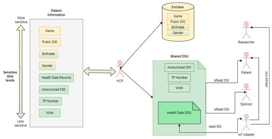Here, we provide here a simple illustration. In Figure 4, we present how the patient information is split into multiple DSUs and the HCP enclave. Furthermore, when health data records should also be written by a different actor (e.g., an IoT adapter), a new DSU is added and mounted in the patient’s DSU to achieve the granularity of data access so that the privacy-by-design mechanism is fully functional.