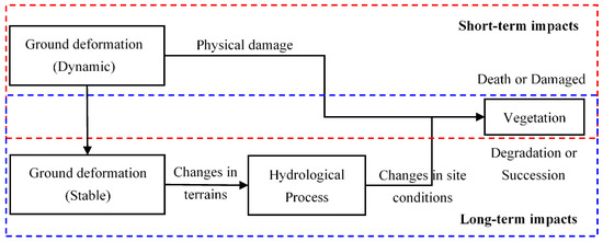 The short-term and long-term impacts of ground deformation on the vegetation are different in terms of the processes and results of the impacts. As shown in Figure 2, for the short-term impacts, when the ground deformation was dynamic, it caused direct physical damage to the plants, and thus it typically led to the death or damage of the vegetation. However, once the ground deformation stabilized, significant changes in the terrain had occurred, which altered the hydrological processes, resulting in changes in the site conditions, and finally leading to the degradation of the involved plant communities.