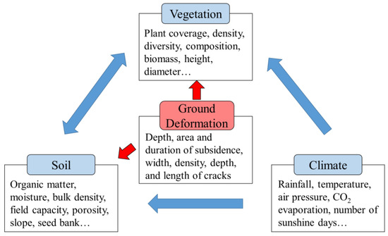 Interactions between the vegetation, soil, and climate factors under the impacts of ground deformation.