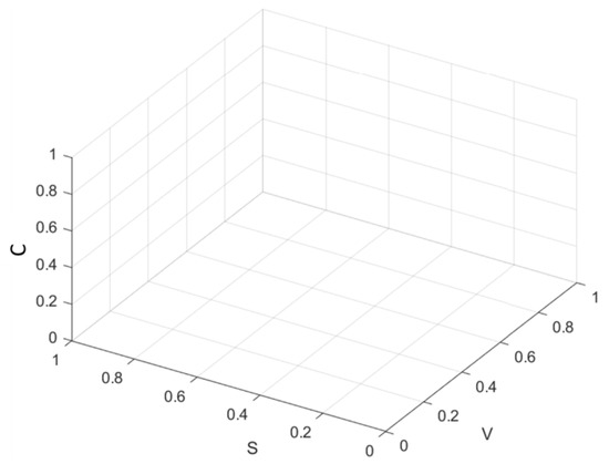 According to Equation (1), the state of the vegetation at any time t can be expressed in the form of G (V, S, and C), and thus a three-dimensional coordinate system composed of the vegetation, soil, and climate can be established as a result (Figure 4). In this system, the coordinate ranges of V, S, and C are all [0, 1]. When the value was equal to 0, the corresponding ecological meaning was deemed as the extinction of the vegetation, loss of soil, or extreme climate, which would make it impossible for the vegetation to survive. When the value was equal to 1, the vegetation, soil, and climate factors were determined as optimal, and that the vegetation was in the best theoretical state.