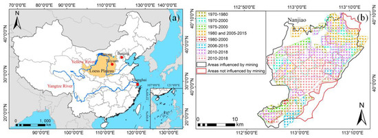 (a) Location of the Nanjiao mining area in the Nanjiao District, Datong City, Shanxi Province, China and (b) the distribution of the subsidence area. The boxes with the years in the legend represent the duration of the mining activities that occurred in each area.