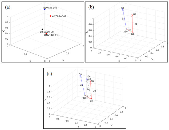 Changes in the vegetation status under the long-term impacts of ground deformation within the VSC system are illustrated in Figure 6. Point G0 (V0, S0, W0) was randomly selected to represent the initial status of the vegetation prior to the ground deformation (Figure 6a). When the deformation occurred between t0 and t1, the vegetation was impacted by the ground deformation during ∆t0–1, and its status subsequently shifted from G0 to G1 (V1, S1, W1). After this, the vegetation experienced a spontaneous succession from t1 to t2 under the long-term impacts of the ground deformation, and then its state shifted from G1 to G2 (V2, S2, W2), where t2 > t1. In addition, an ideal scenario where no mining occurred was also constructed to act as a contrast scenario, and the vegetation subsequently went through a spontaneous succession of ∆t0–1 and ∆t1–2 from G0 to G3 (V3, S3, W3) at t3 (Figure 6b). Since ∆t0–1 is much smaller than ∆t1–2, the changes caused by the natural force during ∆t0–1 can be ignored, and thus the natural driving forces from G1 to G2, and from G1 to G3 can be treated the same. Therefore, ∂3 can be translated and started with G1 to obtain a new vector ∂4, whose end point is G4 (V4, S4, W4). In addition, G4 was set as the starting point and G2 was set as the end point to obtain vector ∂5, respectively. Vector ∂4 reflects the driving force caused by the natural driving of the vegetation at point G1, while G4 represents the theoretical state that the plant could achieve under this driving force (Figure 6c).