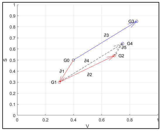 Since the climate factor is only related to the duration, in order to understand the changes occurring in the state of the vegetation, changes in the vegetation and soil elements were mainly considered. Thus, the vector of the vegetation during the developmental process from G0 to G1, G2, and G3 was projected onto the V-S two-dimensional coordinate system (Figure 7). It was found that the difference between the status at G4 and G2 was caused by the long-term impacts of the ground deformation, which is represented by ∂5.