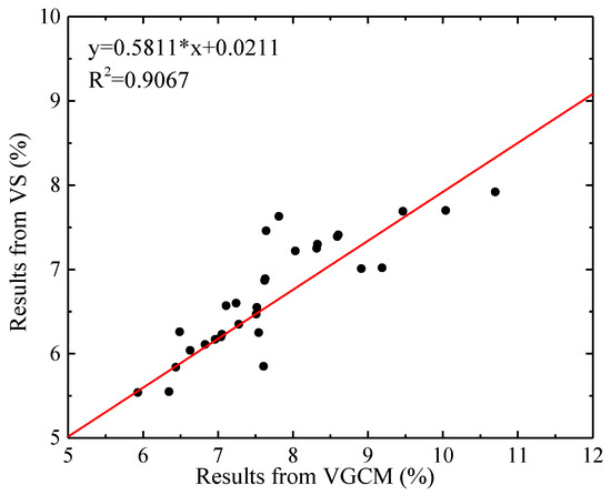 The selected indicators of the vegetation, soil, and climate in the subsidence and reference areas at 1987 and 2017 are shown and compared (Table 1). According to Equation (23) of the VSC model, the indicators of the subsidence and reference areas were used to calculate the long-term impacts of the ground deformation on the vegetation after normalization with Equations (4)–(6). The results showed that the long-term impacts of ground deformation led to a decrease from 5.93% to 10.7% in the status of the trees in the study area according to VSC model. To assess the accuracy of the VSC model, an assessment of the long-term impacts of ground deformation on vegetation from our previous research acted as a reference [41], which applied time-series NDVI data and a vegetation growth contract model (VGCM) to estimate the long-term impacts of ground deformation, showing an average decrease of 6.79% in the status of the trees. The R2 between the results from VSC and VGCM was calculated as 0.9067 through linear regression, showing a high performance in the accuracy of the VSC model (Figure 8).