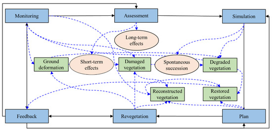 Based on the long-term impacts of ground deformation on vegetation, a framework for implementing revegetation has been proposed (Figure 9). Six steps, including monitoring, assessment, simulation, planning, revegetation, and feedback, are needed to progress from damaged vegetation to reconstructed vegetation.