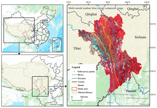 The TPRR is located in the southwestern part of the Qinghai–Tibet Plateau, bordering the Qinghai provincial boundary in the north; Muli, Sichuan in the east; Lijiang, Yunnan in the south; and the China–Myanmar border in the west (Figure 1). In this work, the division of the study area was conducted based on Chinese county boundary data, watershed data, and Qinghai–Tibet Plateau boundary data provided by the National Qinghai–Tibet Plateau Data Center (https://data.tpdc.ac.cn/zh-hans, accessed on 6 October 2022). Coupled with the existing references, we ultimately determined the extent of the TPRR [17,18].