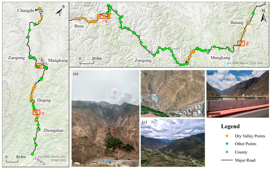 Location of field survey points along the Yunnan–Tibet and Sichuan–Tibet routes. Panels (a–d) show four typical dry valleys in each watershed in the study area (the locations of which are indicated by the red squares).