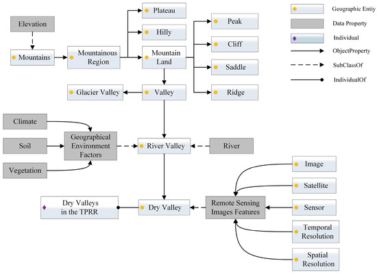 The difficulty in constructing a dry valley ontology is how to determine the geographical relationships between multiple complex factors in the domain and the semantic relationships between concepts [31]. Geographical ontology provides a more rigorous logic and mechanism for geographical cognition and conceptual expression [32]; therefore, the principles and methods of geographical ontology can be used to construct a dry valley ontology. Based on the identification and analysis of dry valley concepts, we used Protege 5.5.0 to complete the semantic analysis and logical reasoning of dry valley concepts using the OWL language and obtained the dry valley ontology model (Figure 3).