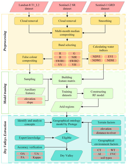 Based on the dry valley ontological model and the related spatial analysis function of ArcGIS10.6, we overlayed the DEM, geographical environmental factors, and image features to obtain the scope of the DVT. Since the overlay analysis was based on the calculation of pixels, it was inevitable that there would be abnormal plaques. To ensure the accuracy of the extent of the DVT, we masked the outcome raster using distance-to-river data to reduce the influence from anomalous plaques. Figure 4 shows the main steps taken in defining the scope of dry valleys in this study.