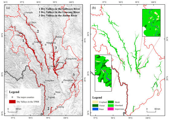 Spatial distribution and land cover of the DVT: (a) the spatial distribution (using the shadow of the mountains as the base map); (b) the land cover distribution.